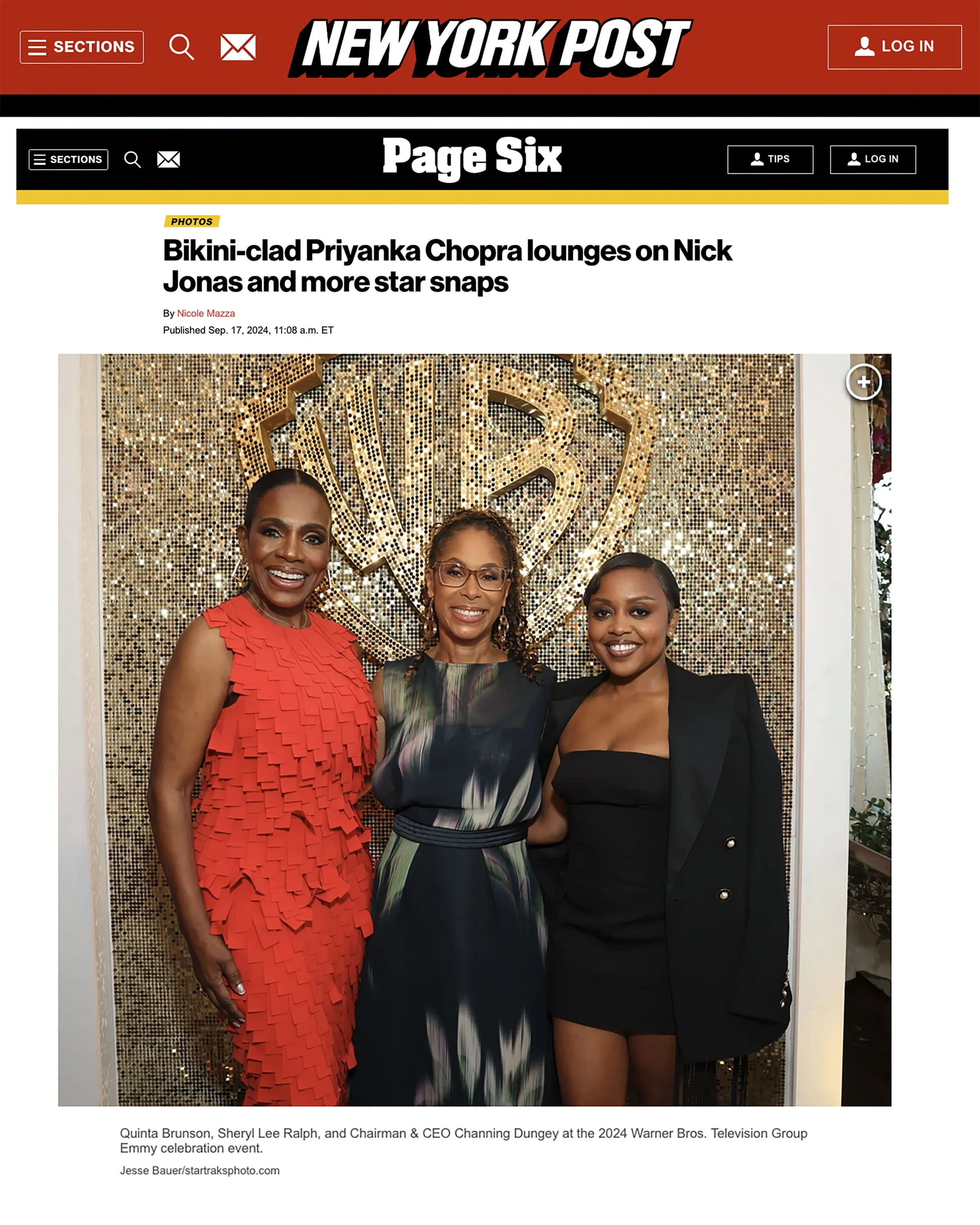 Caption that ran: Quinta Brunson, Sheryl Lee Ralph, and Chairman & CEO Channing Dungey attended the 2024 Warner Bros. Television Group Emmy Celebration event.
