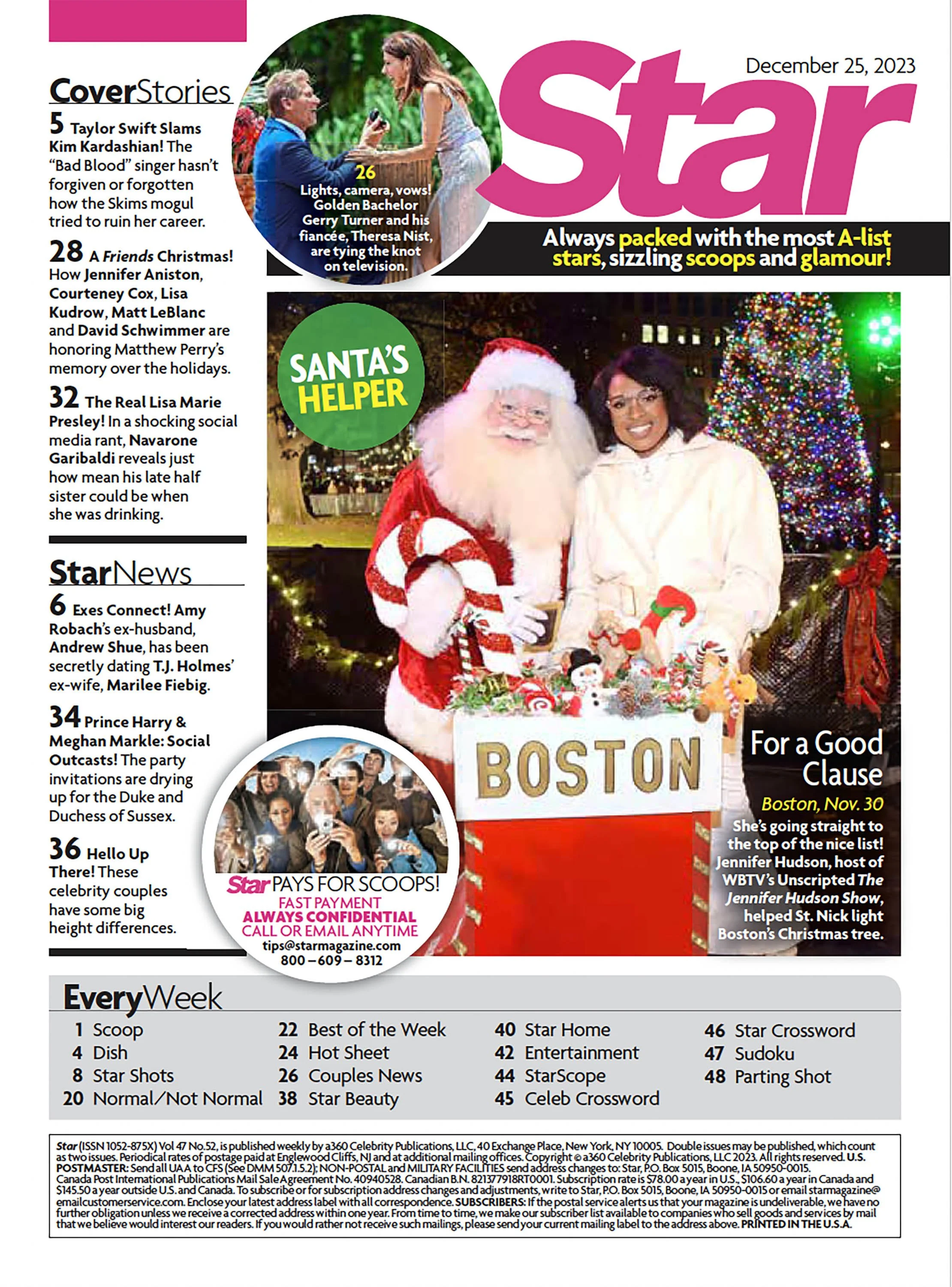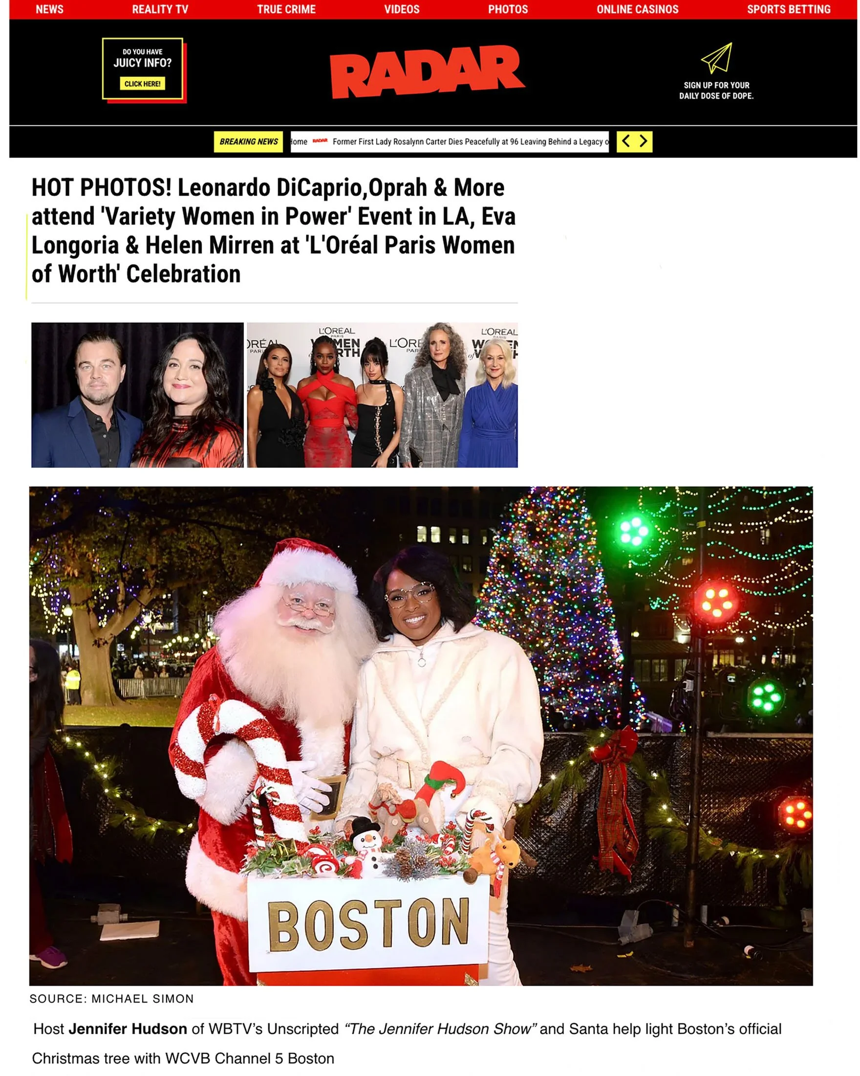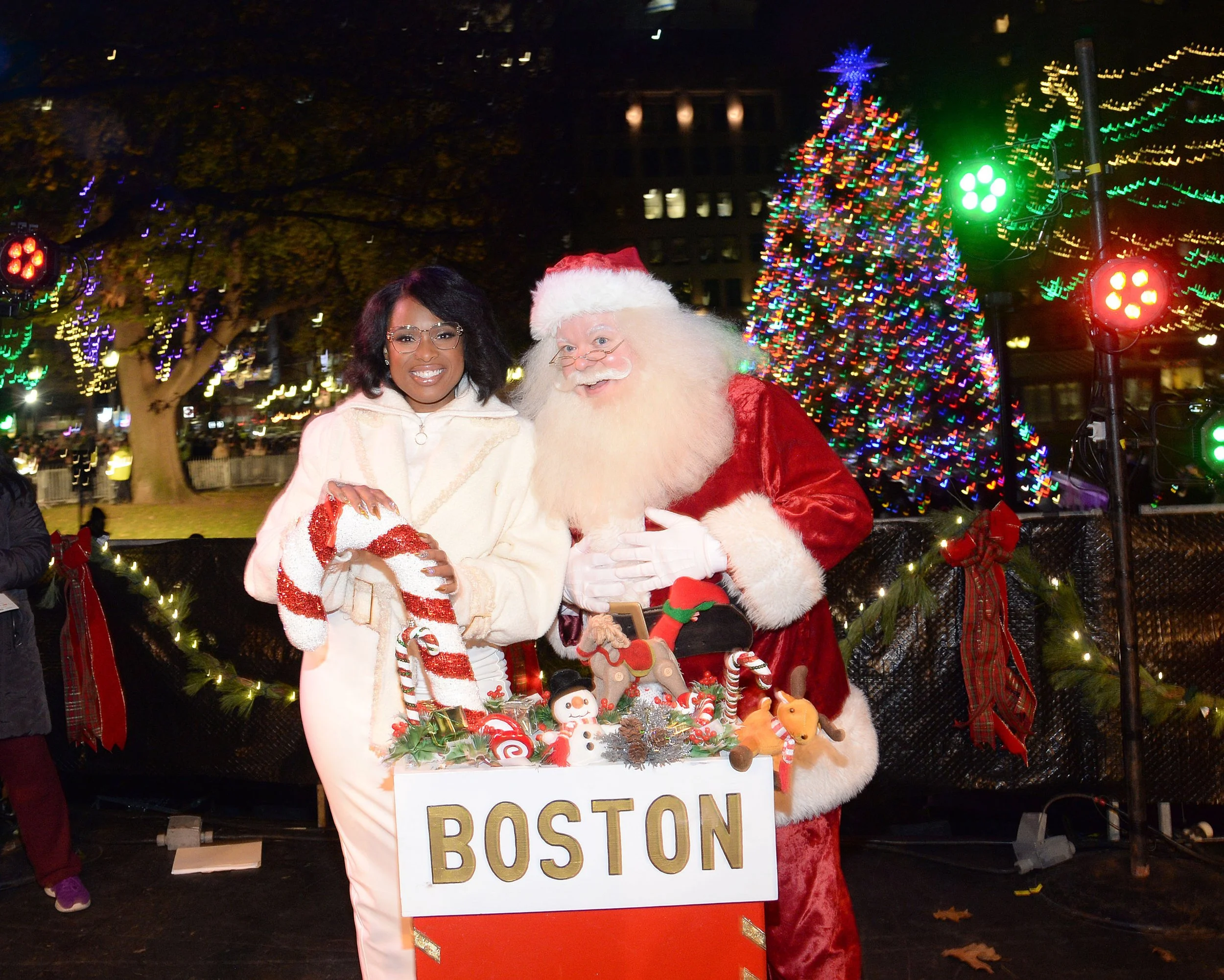 Caption that ran: Host Jennifer Hudson of WBTV’s Unscripted “The Jennifer Hudson Show” and Santa help light Boston’s official Christmas tree with WCVB Channel 5 Boston.