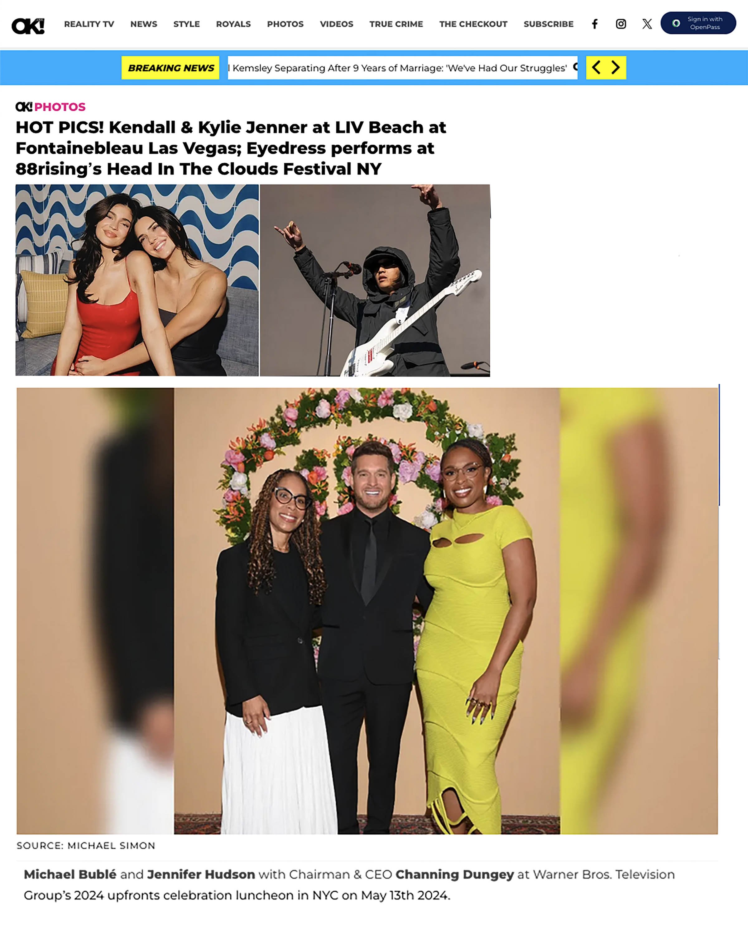 Caption that ran: Mega stars Michael Bublé and Jennifer Hudson with Chairman & CEO Channing Dungey at Warner Bros. Television Group’s 2024 upfronts celebration luncheon in NYC.