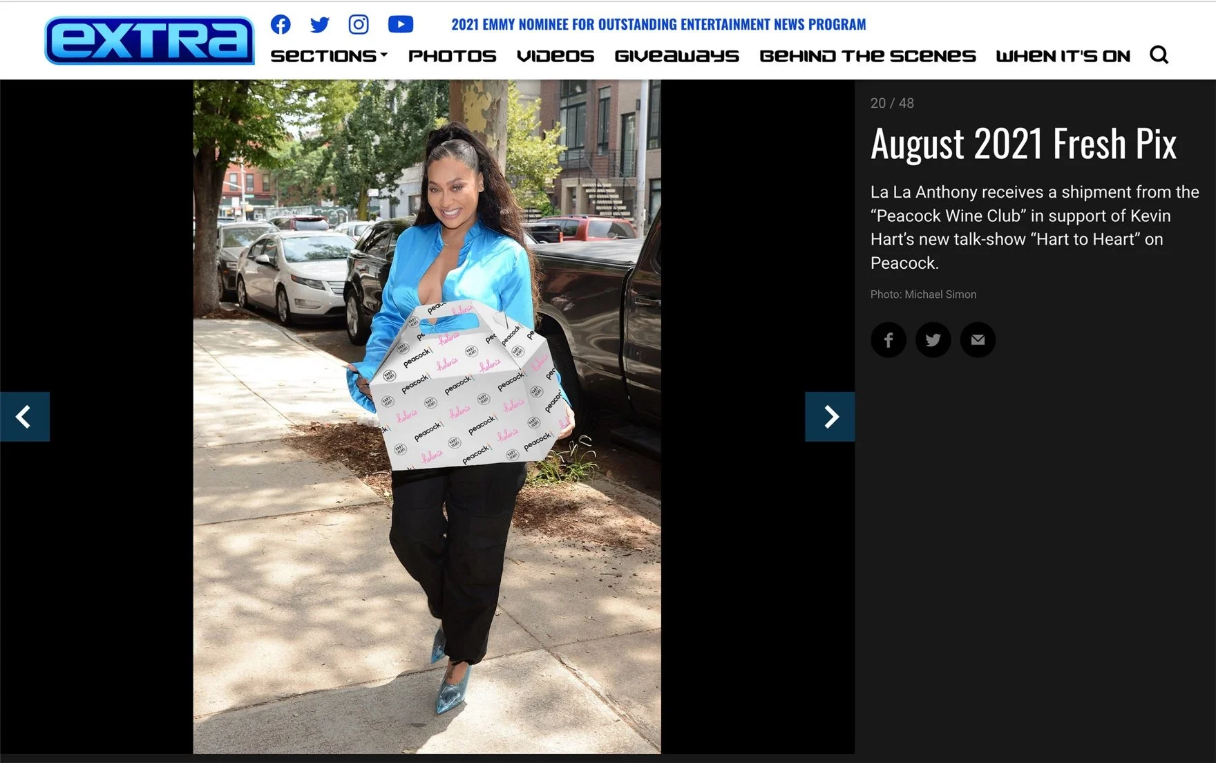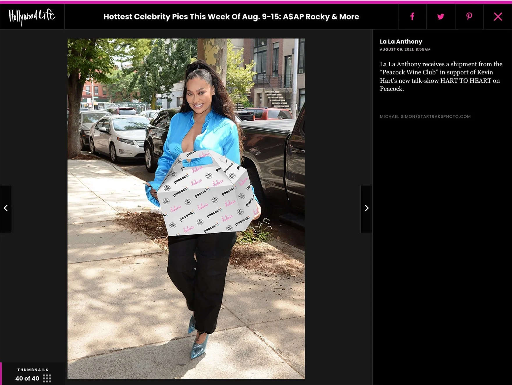 Caption that ran: Lala Anthony receives a shipment from the “Peacock Wine Club” in support of Kevin Hart’s new talk show Hart to Hearton Peacock.