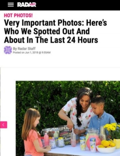 Caption that ran:Tia Mowry and her son Cree are kicking off summer with some fresh Wyler's Light lemonade with their neighbors.